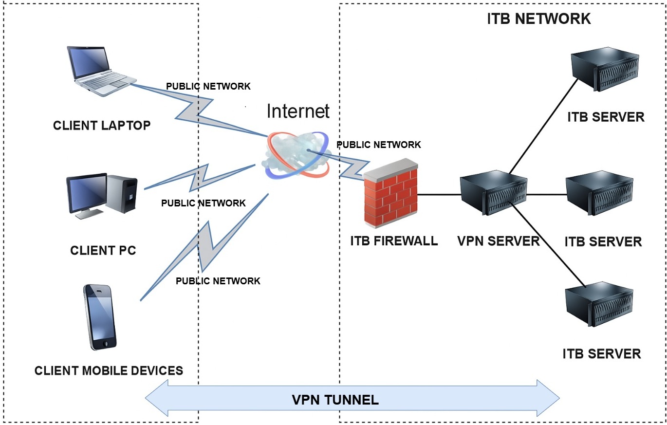 c. Dari luar kampus ITB (Jaringan Publik), koneksi VPN perlu dilakukan untuk mengakses aplikasi dan layanan IT yang bersifat privat dan secara normal harus diakses dari jaringan lokal ITB.