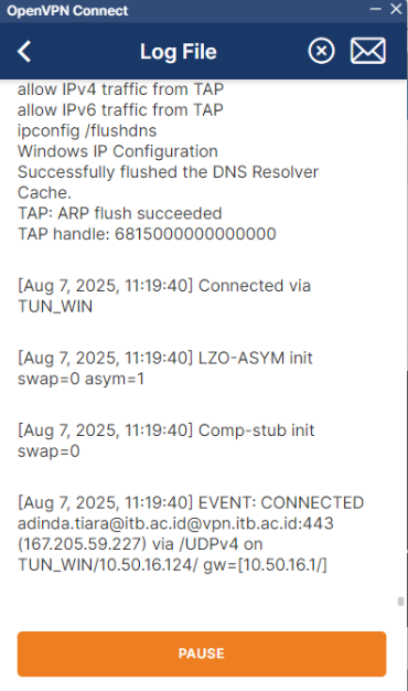Catatan: Jika terkendala terhadap VPN atau tidak connect ke VPN ITB, klik Log aplikasi OpenVPN Connect